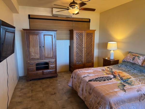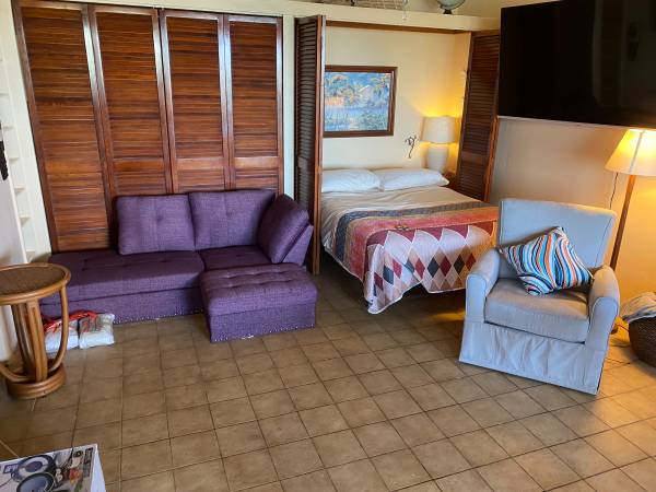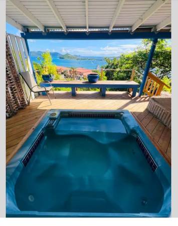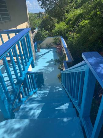 1 Bedroom 1 Bath Condo with Excellent View. 6-unit complex. Fully remodeled. Granite kitchen and Bathroom countertops. New furniture, need to see to appreciate. The property has 4 Top Features that really stand out. A Breathtaking View, Location, best possible power on the Island, and a large workshop / Storage room with a 16-foot-long workbench. We have Wapa, Solar, and a backup Genny. Solar was new in Nov 2023 and lasts for 8 -12 hours before the 4 batteries are drained and the Genny comes on. We hear all the Genny's firing up, while we remain peaceful. The Genny is really only for a storm or severe outages. Genny new in 2020. There is a Murphy bed in the living room and a very large Deck, 225 square feet. Even has a Jacuzzi. This apartment is available for 1 month only, however there are other apartments in the complex for longer term.