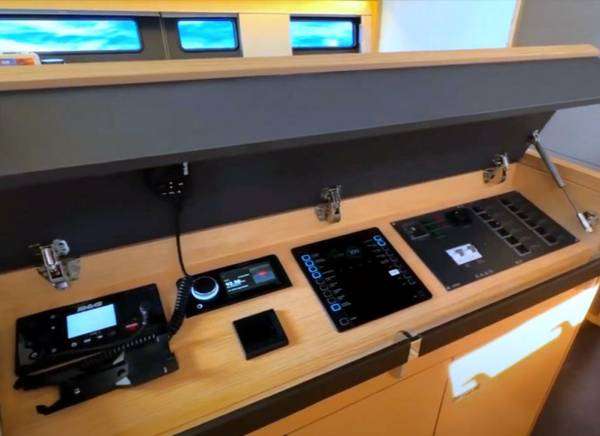 Below deck, the owner's forward stateroom boasts a queen center-line bed, an ensuite head, and a separate shower. The main salon features a fully equipped starboard galley with extra refrigerator freezers, gimbaled stove and ample storage. The versatile port-side dinette transforms into a large bed or sofa at the push of a button. A central navigation/entertainment station with a pop-up TV creates an ideal setup for movie nights. Twin aft cabins, each with its own head (the port cabin with a full head and separate shower), offer generous interior living space. This layout makes the Hanse 510 an outstanding performance cruiser, blending luxurious comfort with sailing performance.