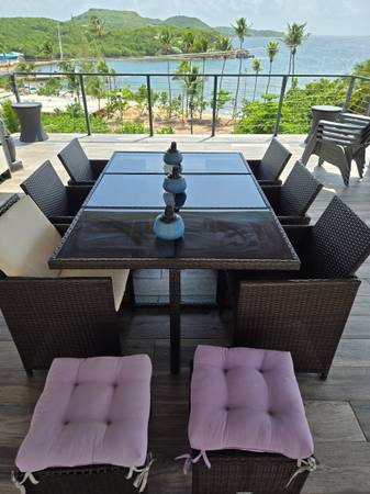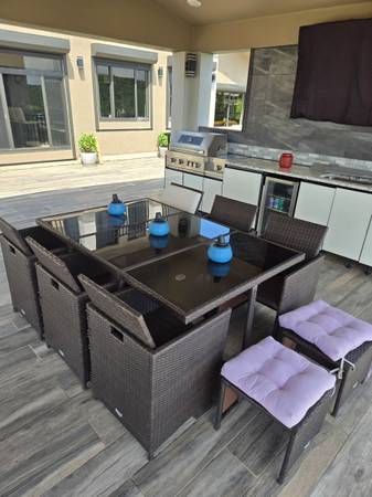 Outdoor dining table wick with chairs. Please note that chairs have cushions but no covers. You will have to order cushions online.